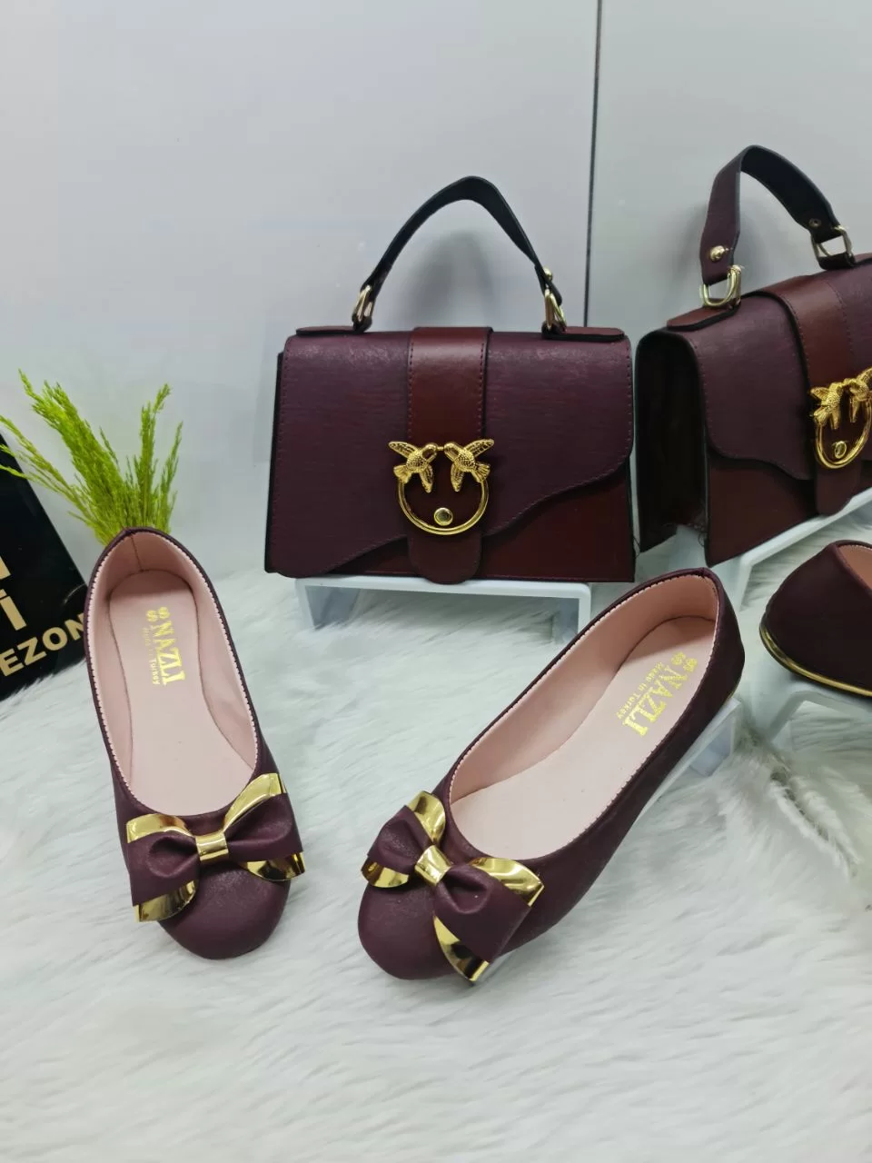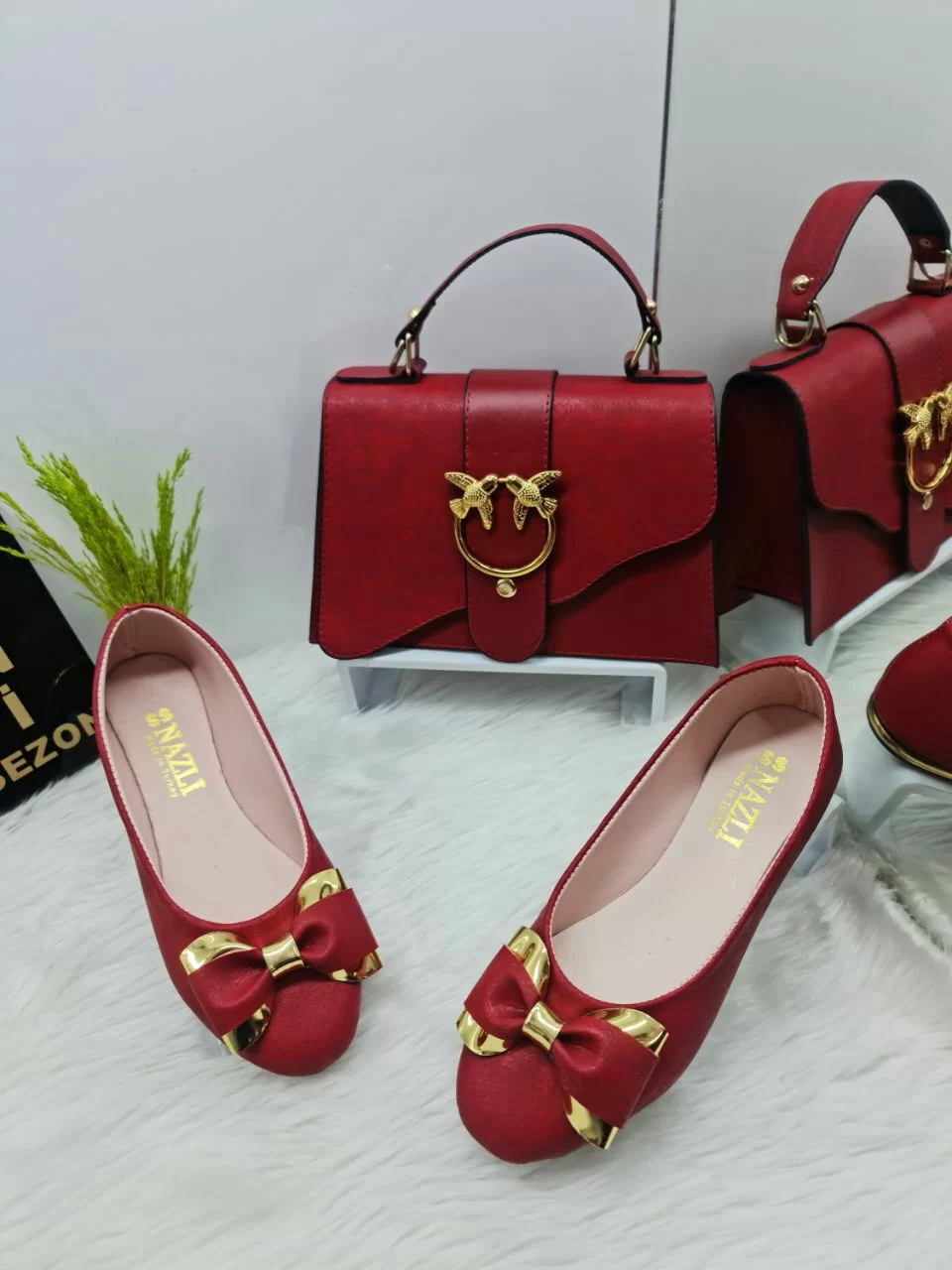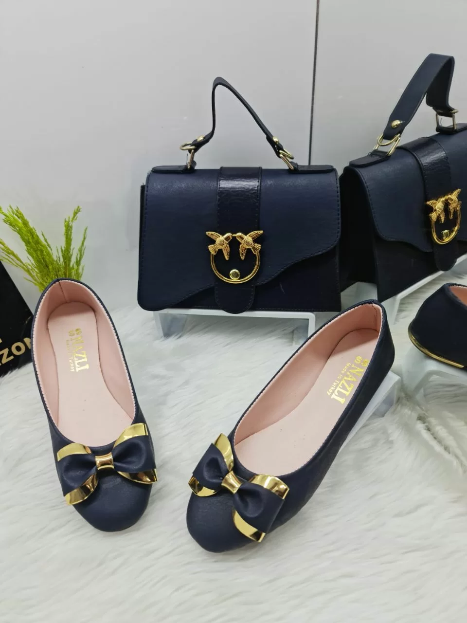 Trend Fashion women handbag, gold color birds figures on bag and bow tie on loafers.